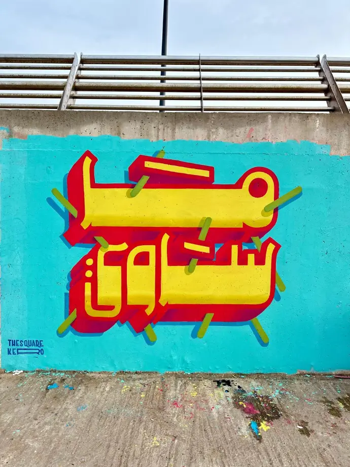 This collaboration serves as a focused dialogue on the structural evolution of script, where letterforms are treated as kinetic, architectural volumes. Featuring vibrant yellow characters with deep red 3D depth, the composition projects a striking weight against a saturated turquoise field. By emphasizing the "floating" nature of these typographic elements, the work explores how distinct regional styles can be fused into a singular, cohesive system, transforming the wall into a study of rhythmic volume and graphic balance.